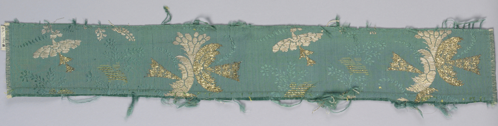 This is a Fragment. It is dated 18th century and we acquired it in 1902. Its medium is silk, metallic and its technique is plain weave with weft floats and discontinuous supplementary weft. It is a part of the Textiles department.