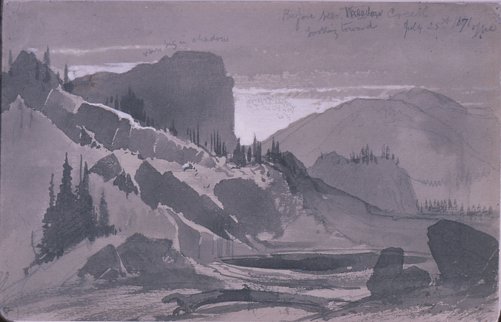 Recto: Inscribed in graphite over a mountain, at upper left center: very big in shadow; and again at upper right: Before near, Meadow Creek / looking toward July 25th 1871 T. M.; and at lower left corner: (8) Verso: Inscribed in graphite, at lower right center: caves; and again at upper right: near Meadow Creek / looking toward ... .; [according to Rudolph Berliner in 1942] in pen and ink: No. 311.