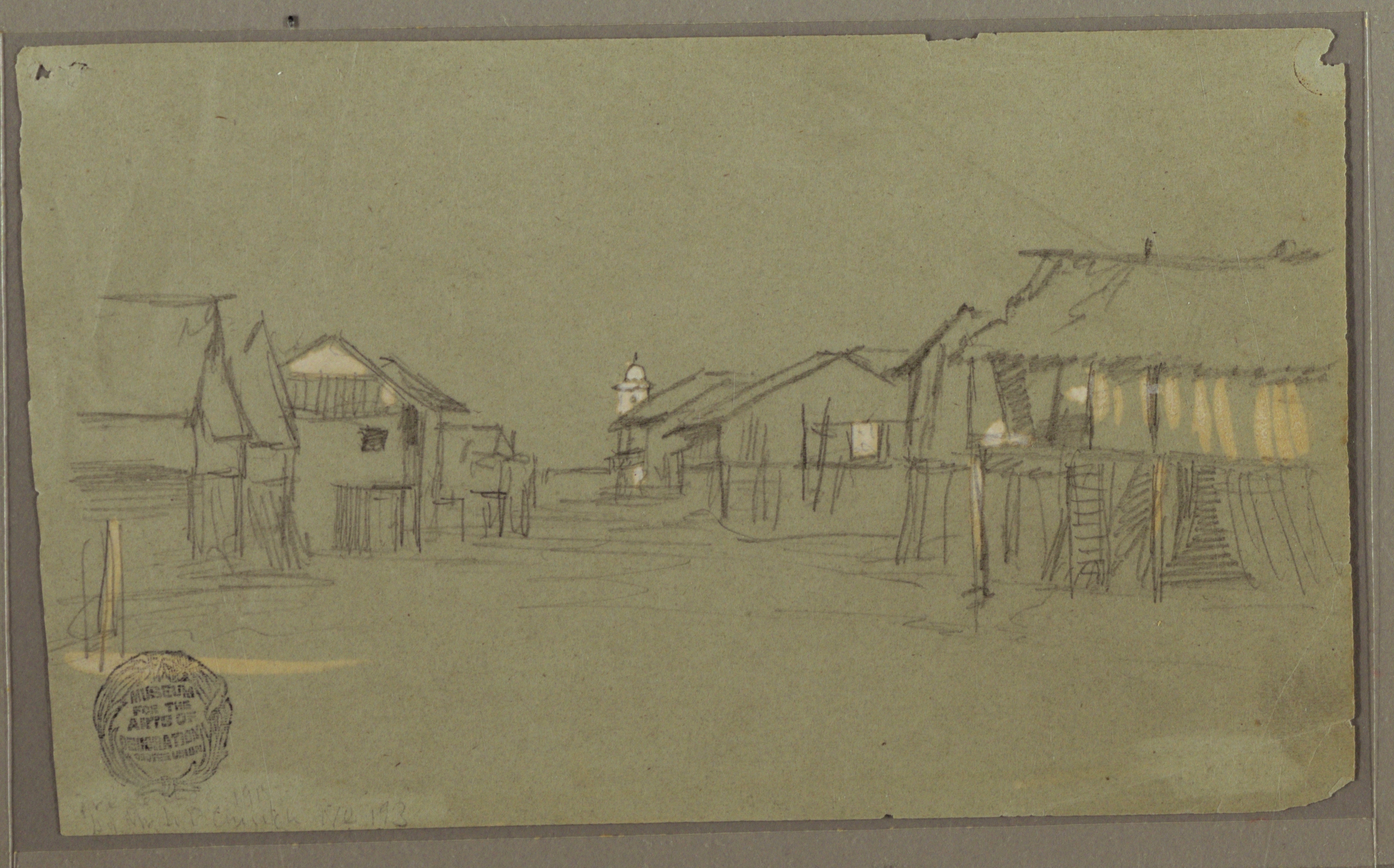 Drawing, Street Scene, Guayaquil, Ecuador; Frederic Edwin Church (American, 1826–1900); Ecuador; graphite and white gouache on grey-green wove paper; 10.9 × 18.6 cm (4 5/16 × 7 5/16 in.); Gift of Louis P. Church; 1917-4-193