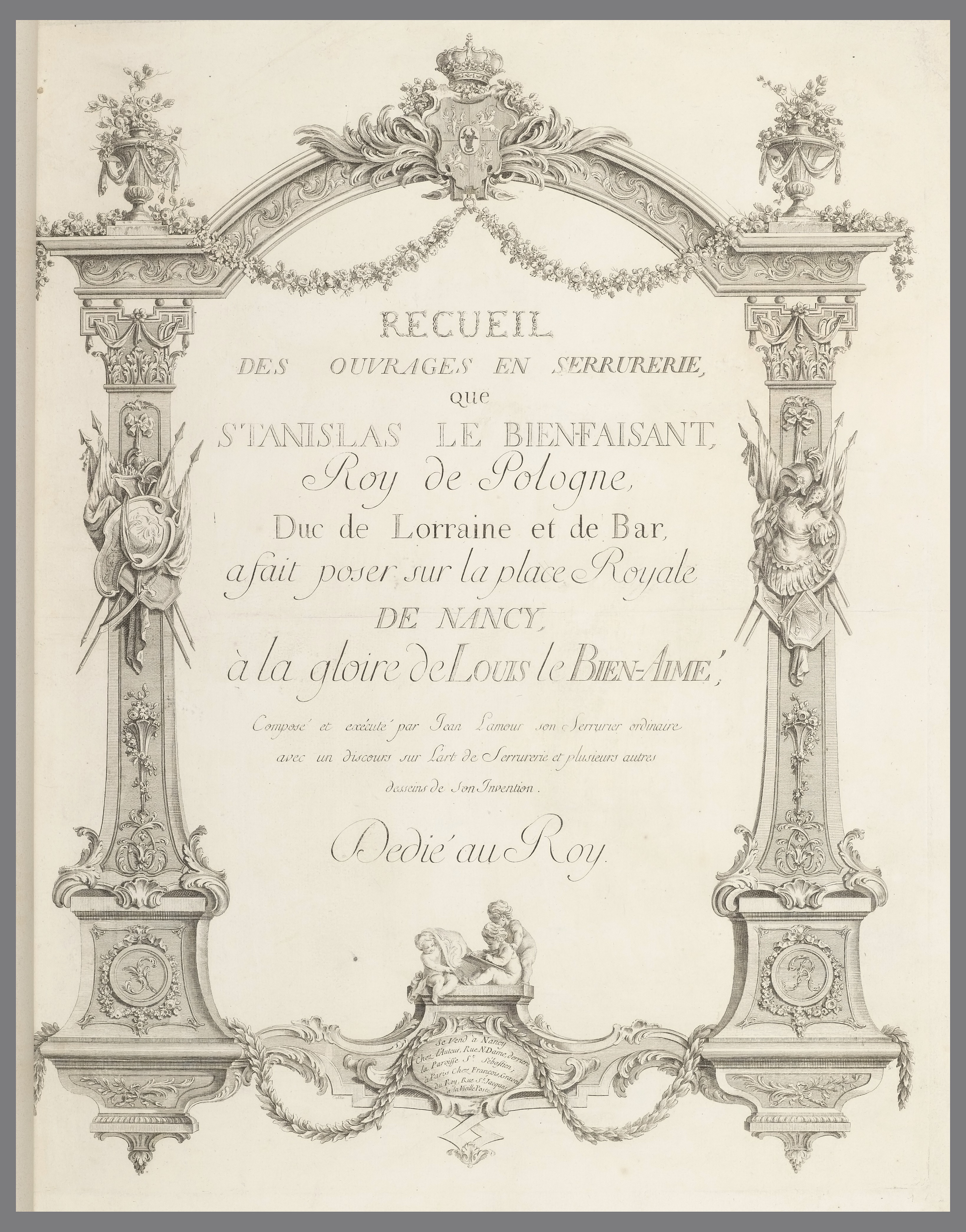 <ref name=CH>{{cite web |url=https://collection.cooperhewitt.org/objects/18222227/ |title=Bound Volume, RECUEIL DES OUVRAGES EN SERRURERIE que STANISLAS LE BIEN-FAISANT, Roy de Pologne, Duc de Lorraine et de Bar a fait poser sur la place Royale DE NANCY, à la gloire de Louis le BIEN-AIMÉ, Composé et exécuté par Jean Lamour son Serrurier ordinaire avec un discours sur L’art de Serrurerie et plusieurs autres desseins de Son Invention. Dedié au Roy. |author=Cooper Hewitt, Smithsonian Design Museum |accessdate=20 December 2025 |publisher=Smithsonian Institution}}</ref>