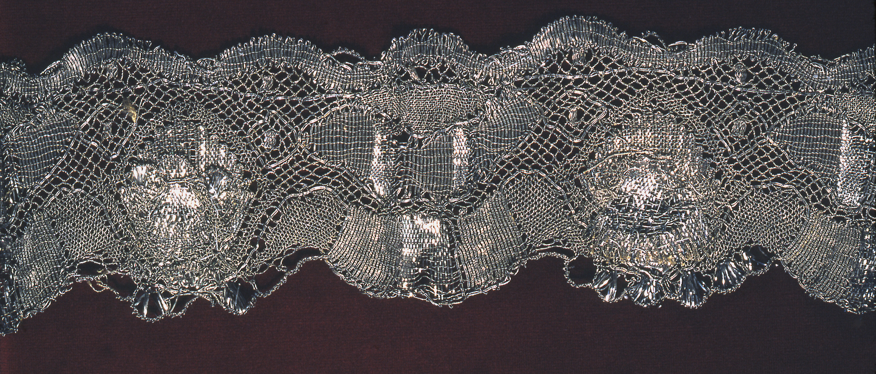 This is a Band. It is dated 16th–17th century and we acquired it in 1950. Its medium is metal strips and metal thread and its technique is bobbin lace, metallic. It is a part of the Textiles department.
