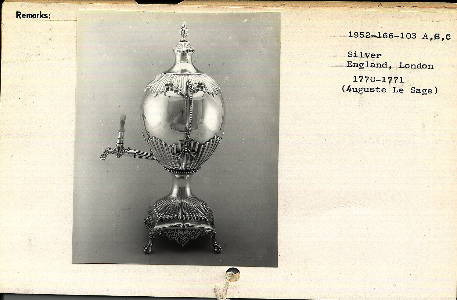 Hot Water Urn Hot Water Urn; Made by Auguste Le Sage (British, active London 1769 – 1780s); England; silver, bone; H x W x D (overall): 51.1 × 28.5 × 29.4 cm (20 1/8 × 11 1/4 × 11 9/16 in.) H x W x D (a: urn): 22 × 31.1 × 29 cm (8 11/16 × 12 1/4 × 11 7/16 in.) H x diam. (b: lid): 13 × 9.9 cm (5 1/8 × 3 7/8 in.) H x W x D (c: stand): 18.2 × 17 × 17 cm (7 3/16 × 6 11/16 × 6 11/16 in.); Gift of Anonymous Donor; 1952-166-103-a/c