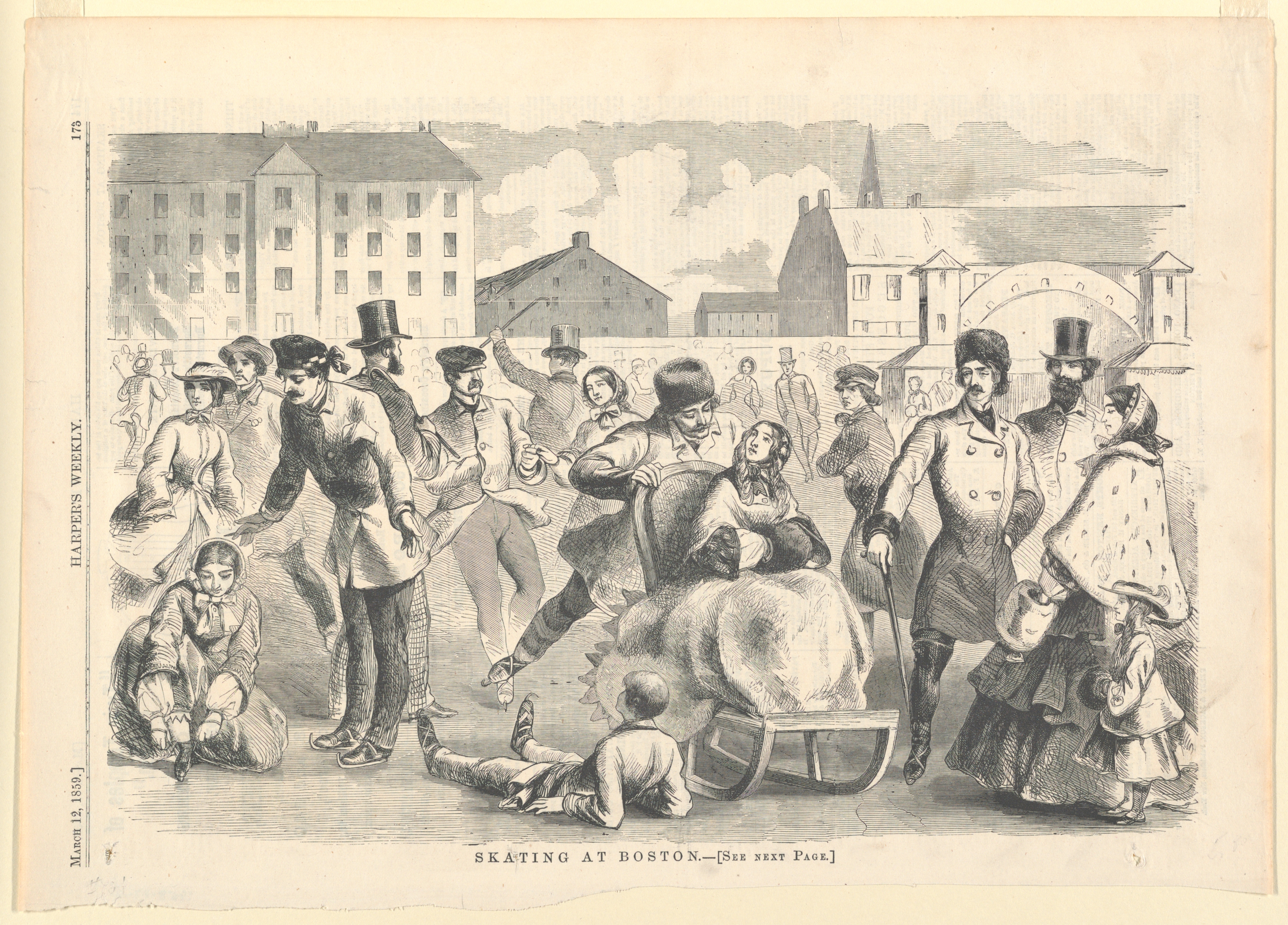 Print, Skating at Boston; After Winslow Homer (American, 1836–1910); Published by Harper's Weekly, Harper & Bros.; USA; wood engraving in black ink on paper; 28.5 × 40 cm (11 1/4 × 15 3/4 in.); Museum purchase through gift of the Estate of David Wolfe Bishop; 1958-27-2