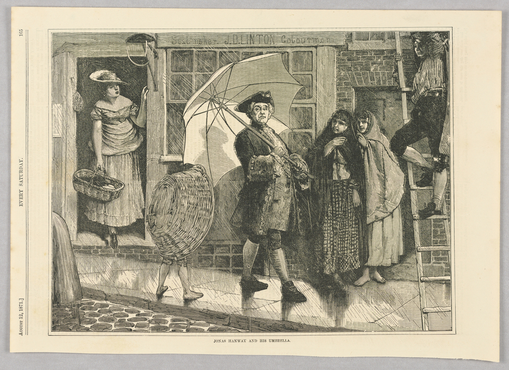 Print, Jonas Hanway and His Umbrella, Illustration for Every Saturday (August 12, 1875, p. 161)