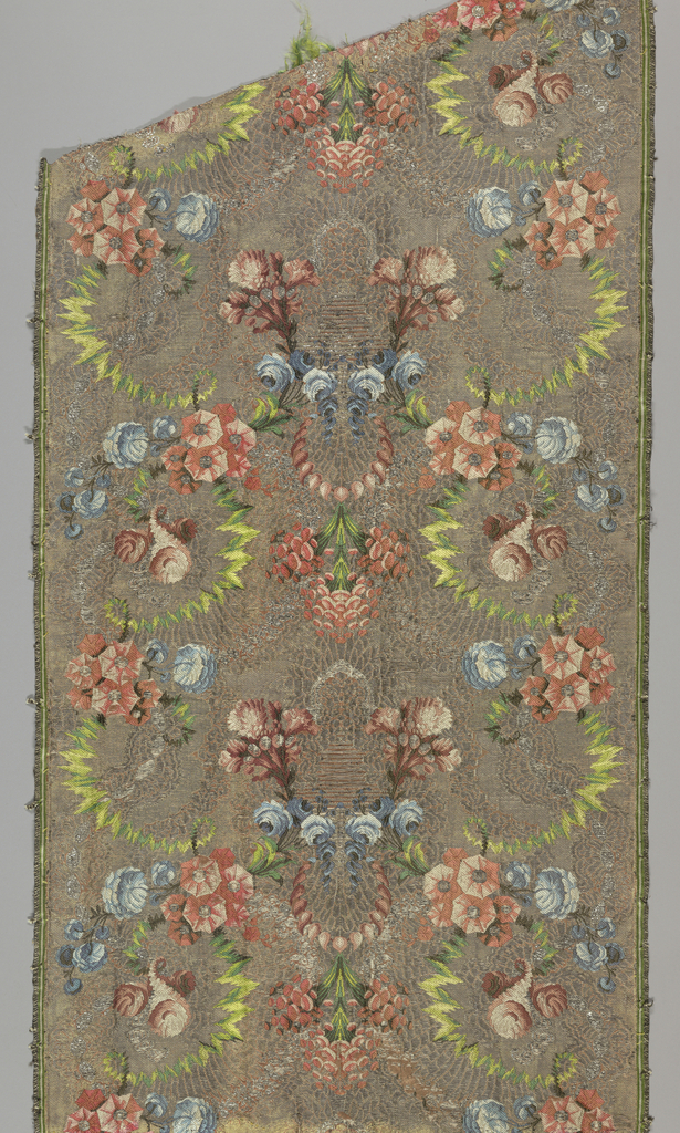 This is a Fragments. It is dated 1730–49 and we acquired it in 1962. Its medium is silk, metal and its technique is 5-harness satin foundation patterned by floats of the complementary foundation wefts and discontinuous supplementary wefts bound on the front in 1/4 twill by a supplementary warp. It is a part of the Textiles department.