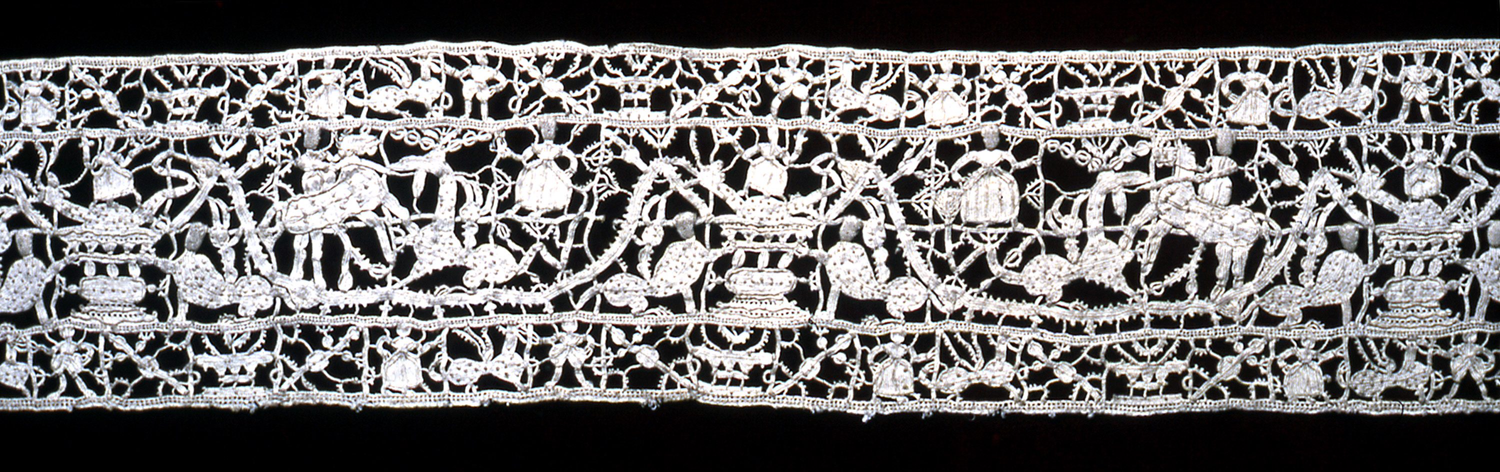 This is a Band. It is dated 1550–1600 and we acquired it in 1962. Its medium is linen and its technique is grid of withdrawn element work with needle lace, reticella style. It is a part of the Textiles department.