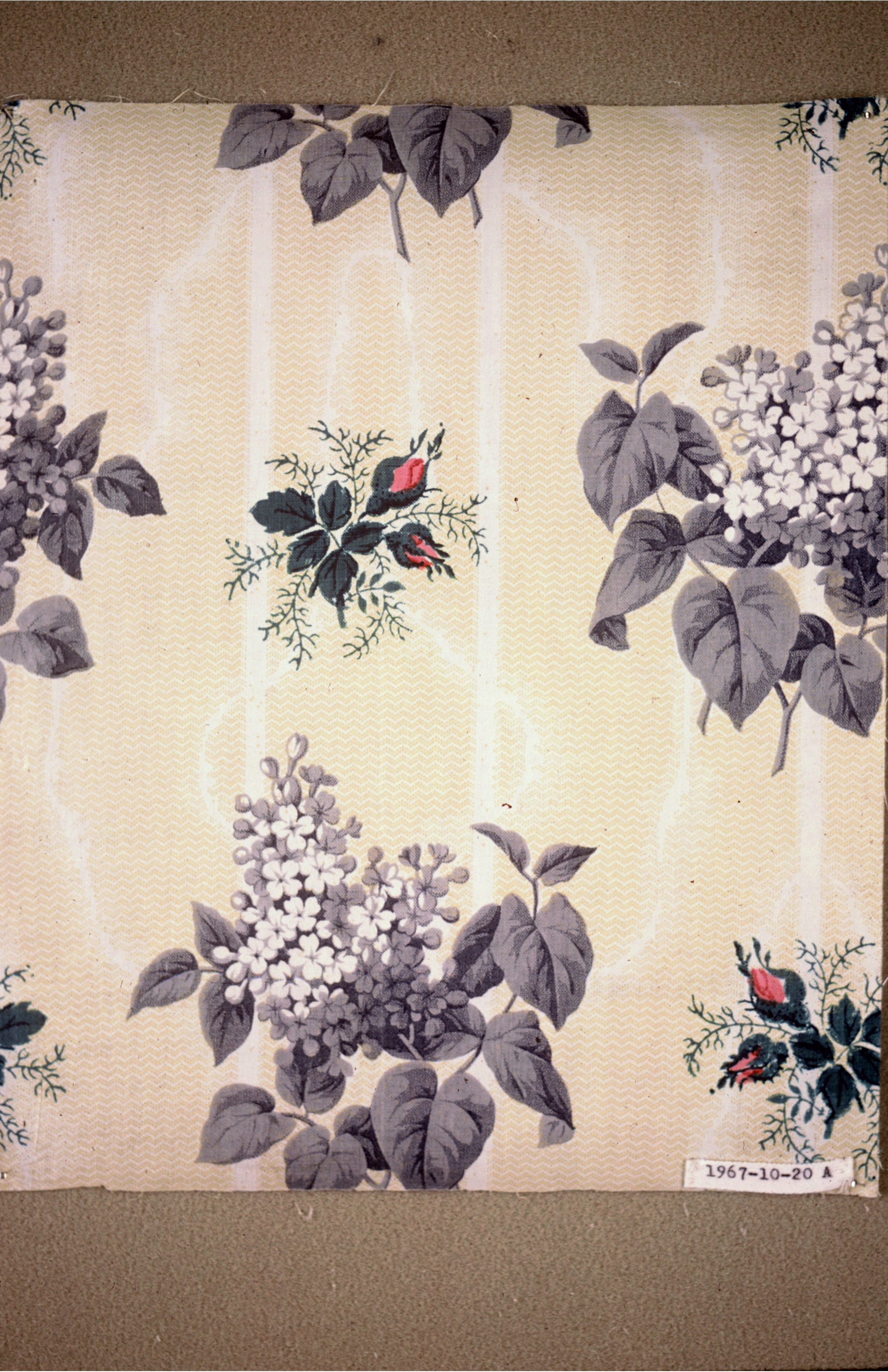 This is a Textile. It is dated mid-19th century and we acquired it in 1967. Its medium is cotton and its technique is printed by engraved roller and block printed; glazed. It is a part of the Textiles department.