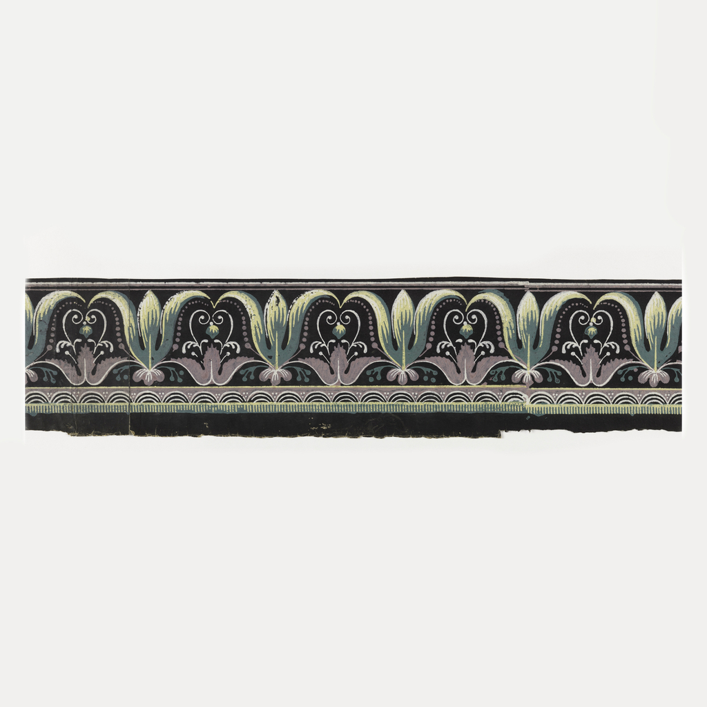 This is a Border. It is dated 1800–1825 and we acquired it in 1972. Its medium is block-printed on handmade paper. It is a part of the Wallcoverings department.