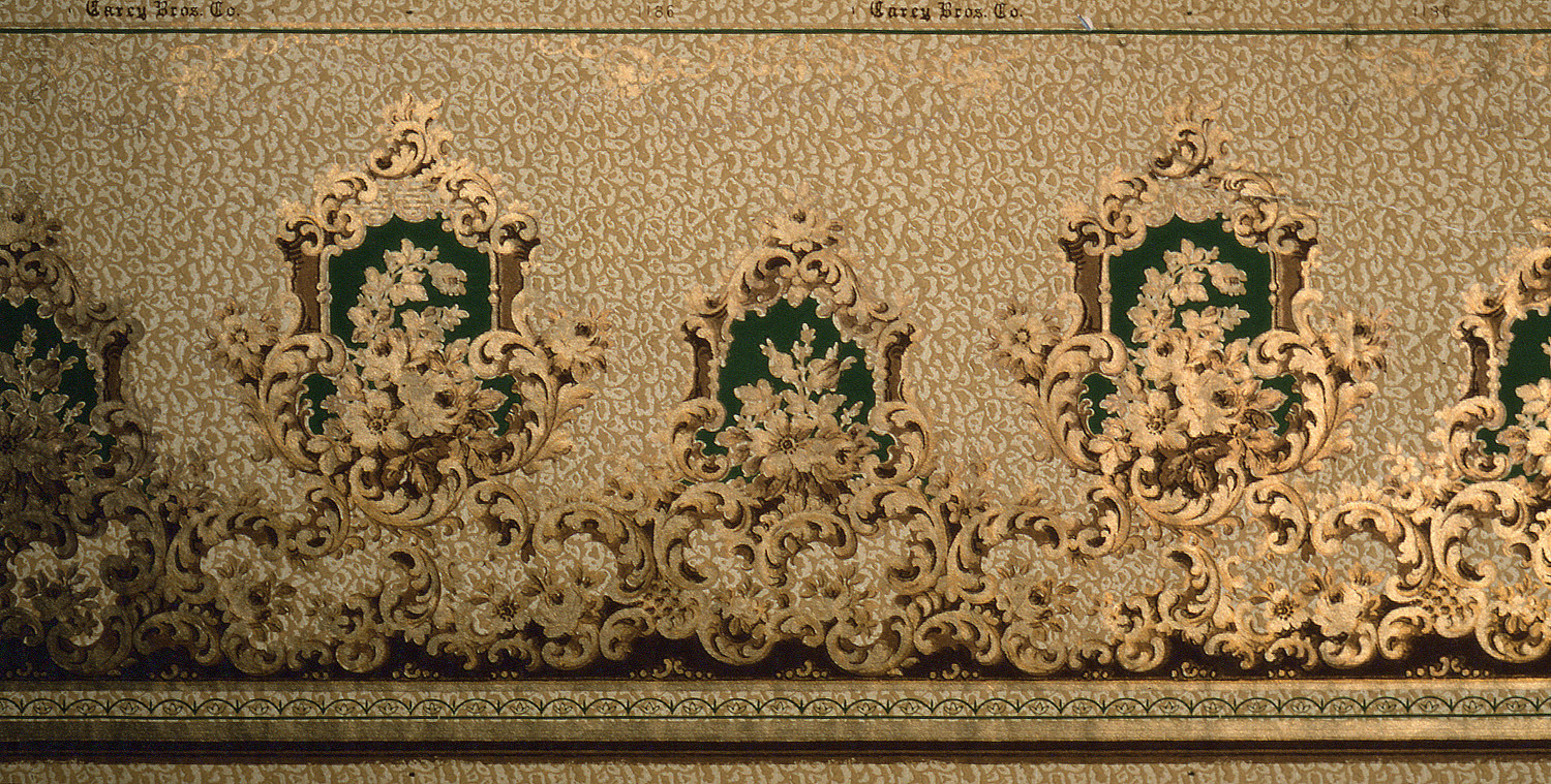 This is a frieze. It was manufactured by Carey Bros. W.P. Mfg. Co.. It is dated 1905–1915 and we acquired it in 1979. Its medium is machine-printed paper, liquid mica. It is a part of the Wallcoverings department.