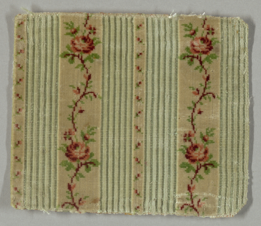 This is a Fragment. It is dated 1750–1800 and we acquired it in 1939. Its medium is silk and its technique is cut voided supplementary warp pile in a cloth foundation (velvet). It is a part of the Textiles department.