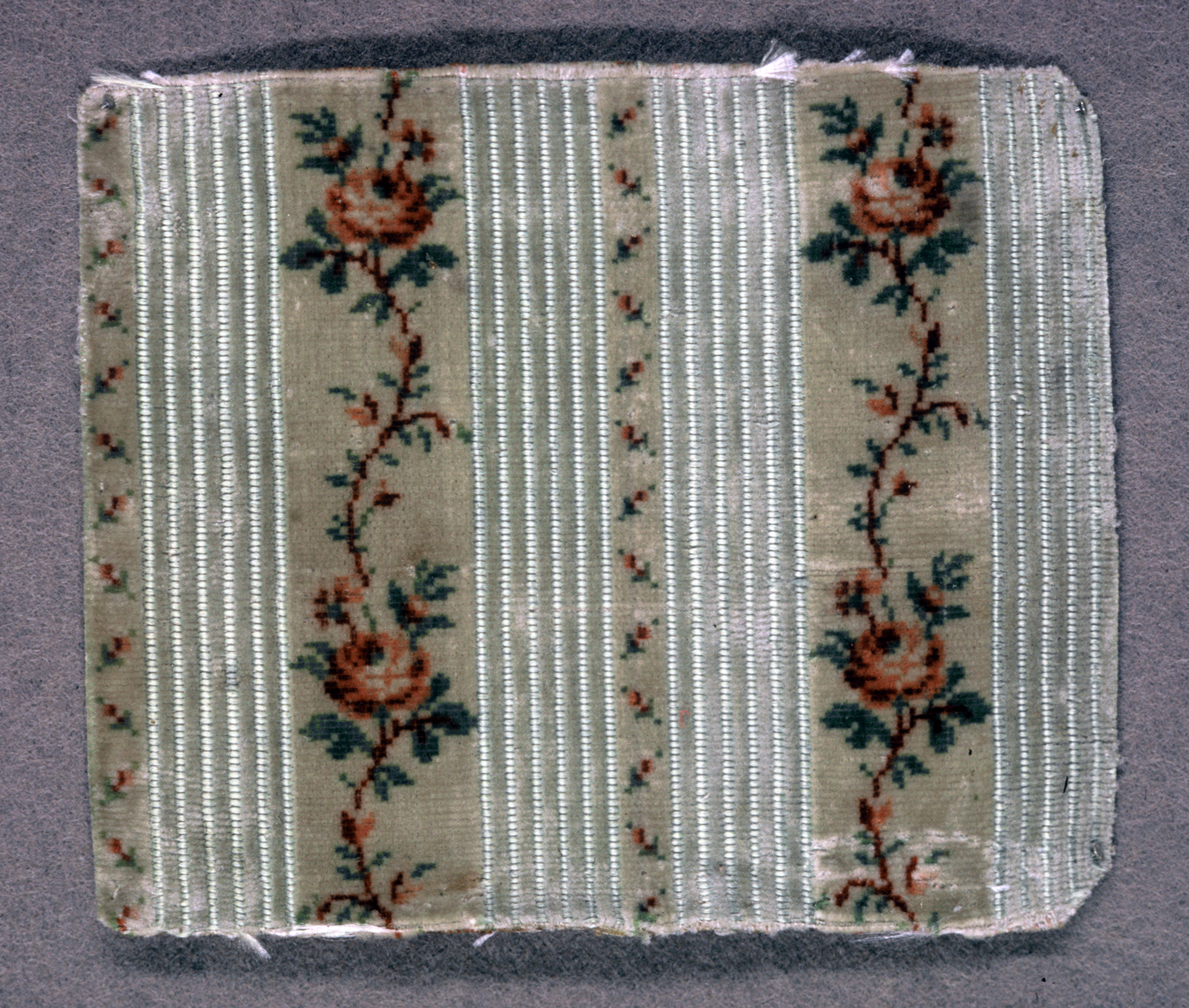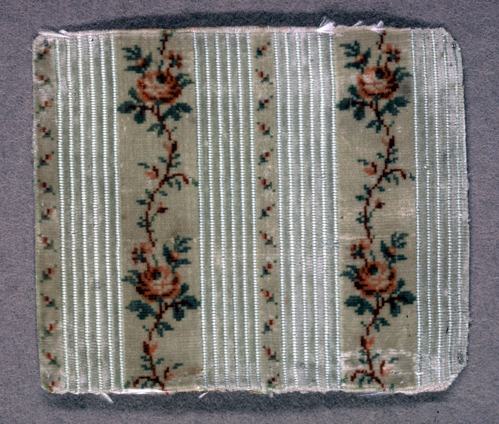 This is a Fragment. It is dated 1750–1800 and we acquired it in 1939. Its medium is silk and its technique is cut voided supplementary warp pile in a cloth foundation (velvet). It is a part of the Textiles department.