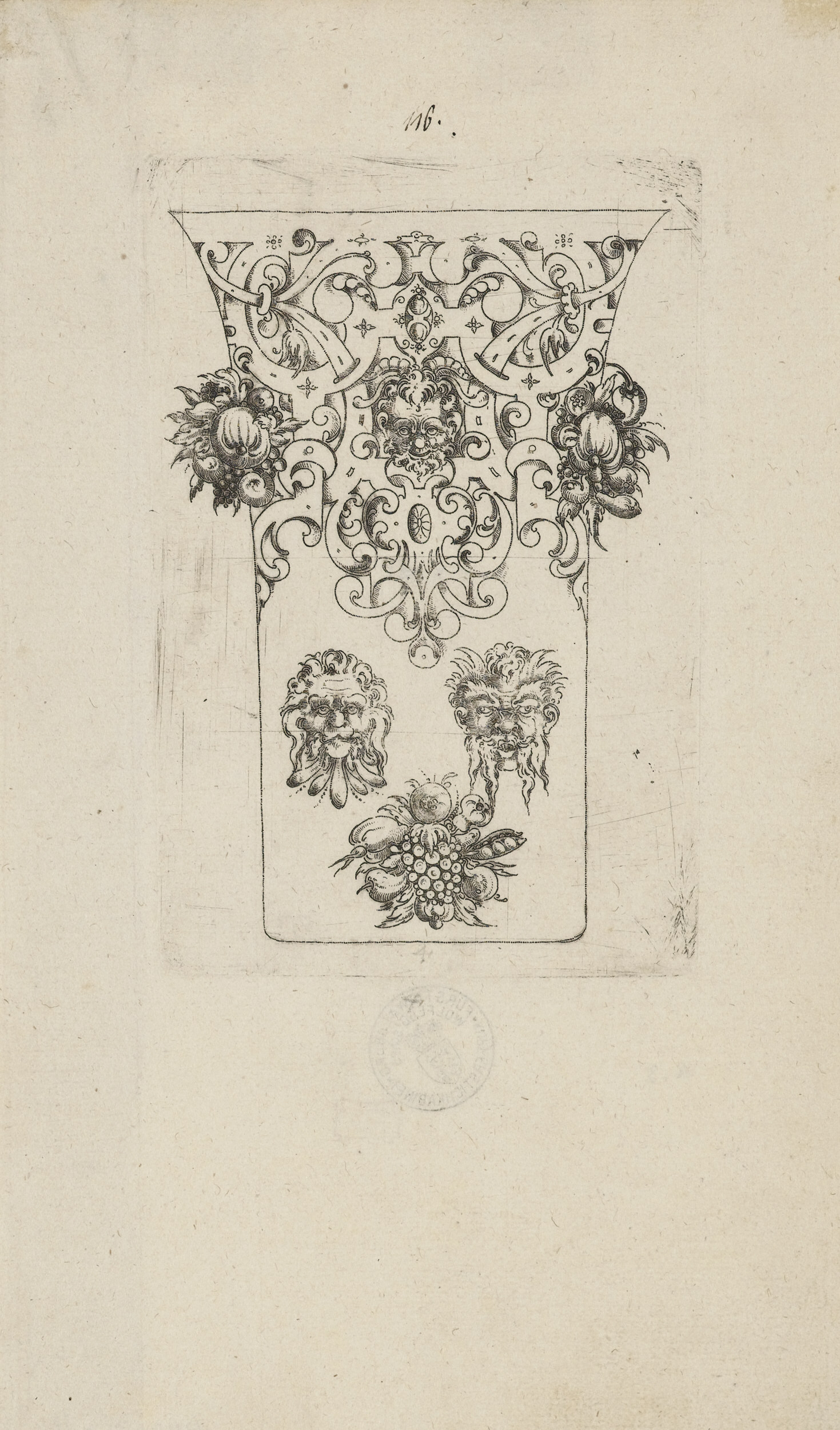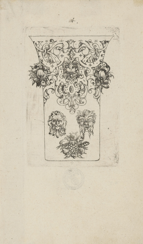 Zan apprenticed as a goldsmith, and his training may have contributed to this relatively restrained series of designs for metalwork cups, which feature layered strapwork as a defining decorative feature, coupled with fruit, plants, and inventive grotesque heads. Zan may have been the first engraver to use the technique of punch-engraving to produce prints.