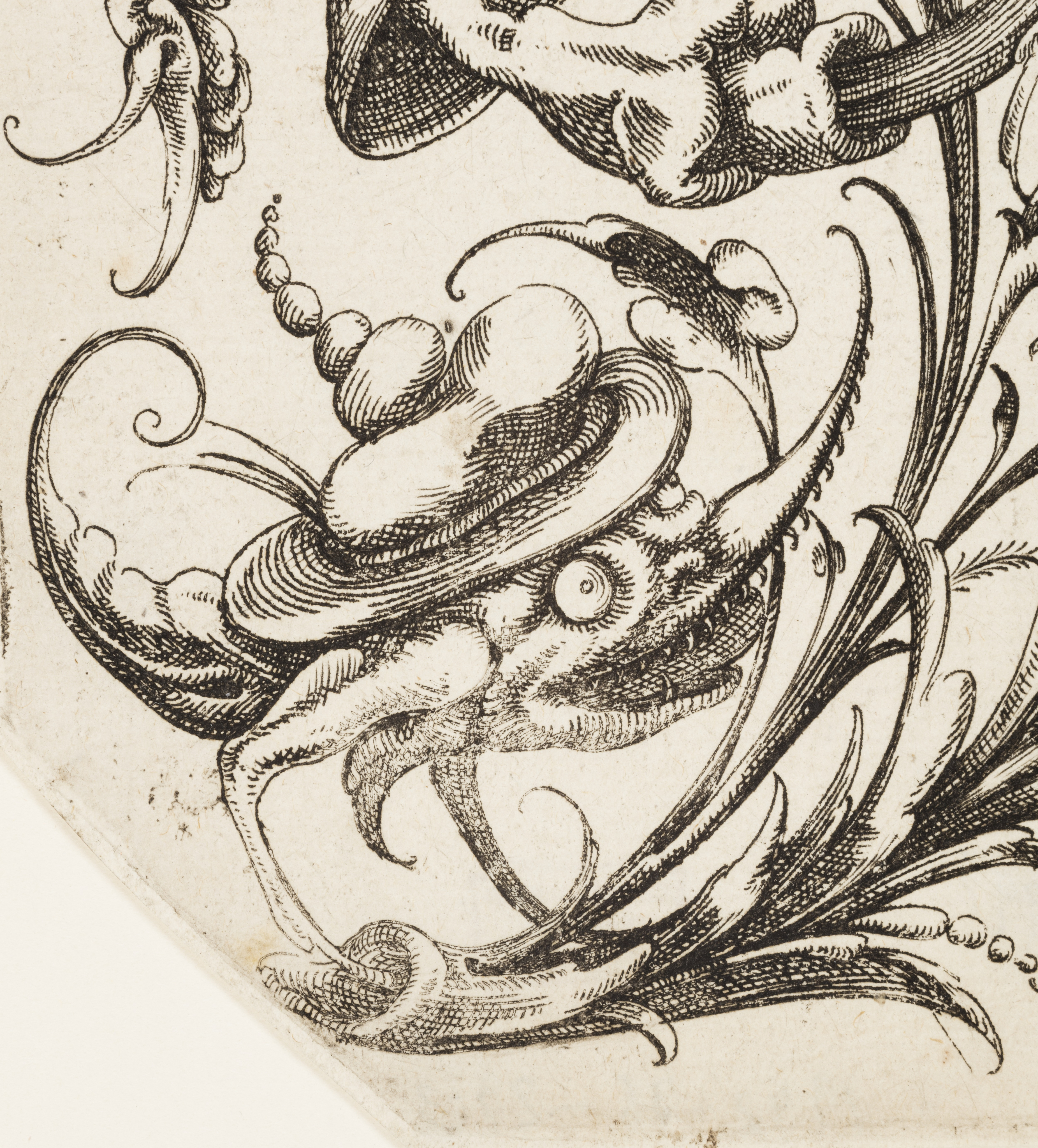 This delicate series of prints was one of several created by Dietterlin the Younger in the years after the publication of Christoph Jamnitzer’s Neüw Grotteßken Buch in 1610. The late Gothic designs for bouquets were likely intended as patterns for metalwork or jewelry and feature spaces for gems and pearls. Dietterlin’s slender, ethereal creations take the grotesque to its most fragile state—vegetal forms turn monstrous as they terminate, and freestanding figures are at once charming and terrifying.