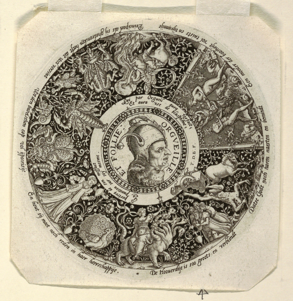 This print is one of a series of designs for the interior decoration of tazza, footed metal bowls, engraved by goldsmith de Bry. The central image features the head of a Fool, which, when turned upside down, cleverly transforms into the head of a satyr. The wide border contains biblical and moralizing scenes set within scrolling foliage, grotesque motifs, and monstrous creatures inspired by reptiles and insects.