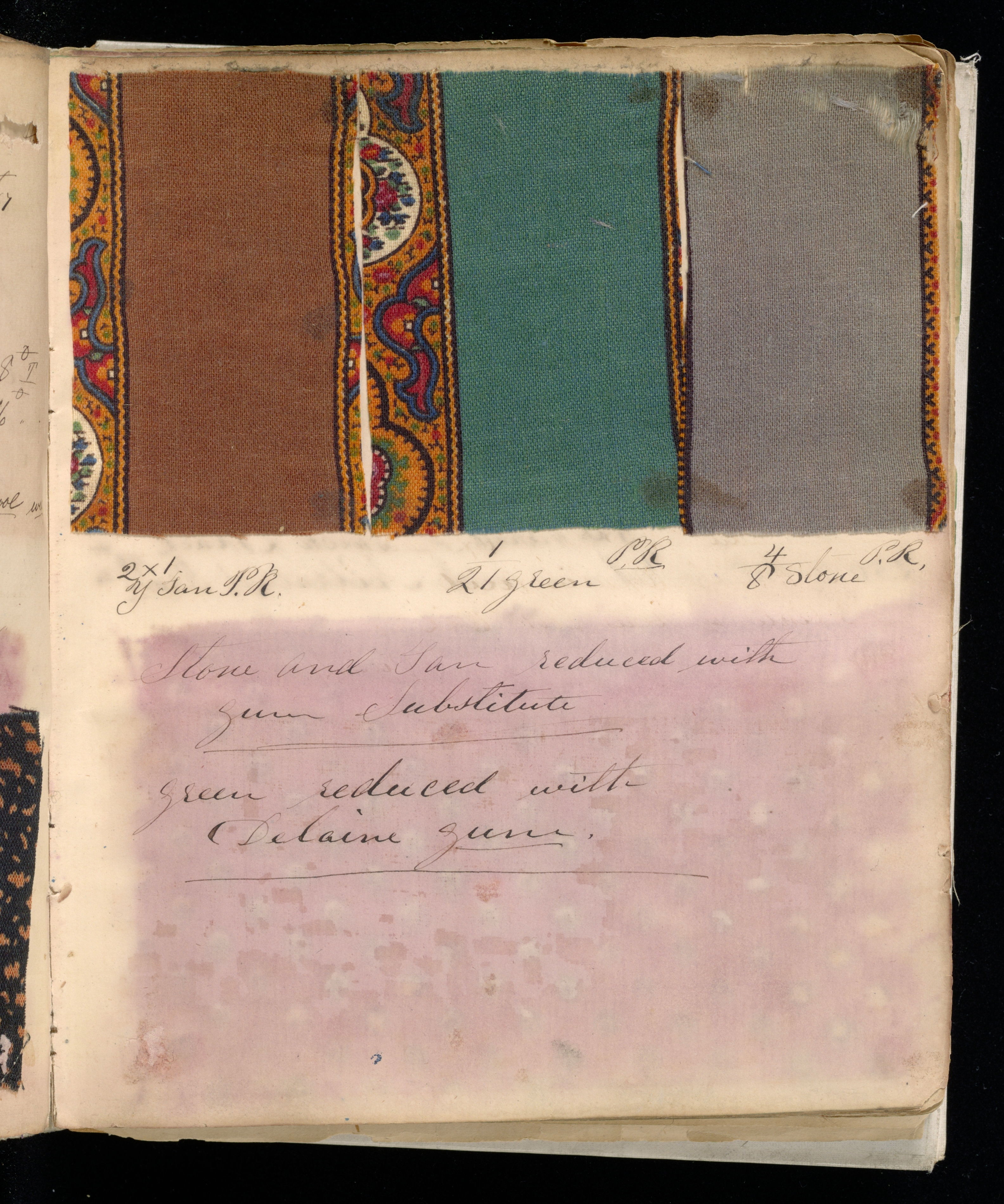This is a Dyer's record book. It was company: Old Pacific Print Works. It is dated 1861–74 and we acquired it in 1945. Its medium is label: board covers, pen and ink on paper pages, cotton samples. It is a part of the Textiles department.