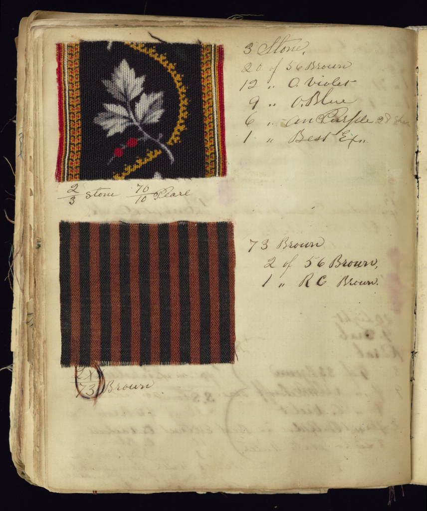 This is a Dyer's record book. It was company: Old Pacific Print Works. It is dated 1861–74 and we acquired it in 1945. Its medium is label: board covers, pen and ink on paper pages, cotton samples. It is a part of the Textiles department.