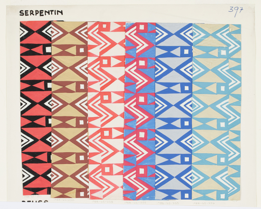 Drawing, Textile Design: Serpentin (Serpentine); Designed by Josef Hoffmann (Austrian, b. Moravia, 1870–1956); Made for Wiener Werkstätte (Austria); brush and gouache on paper; 20.3 × 3.8 cm (8 in. × 1 1/2 in.) Mat: 40.6 × 55.9 cm (16 × 22 in.); Museum purchase from Smithsonian Collections Acquisition and Decorative Arts Association Acquisition Funds; 1988-62-254