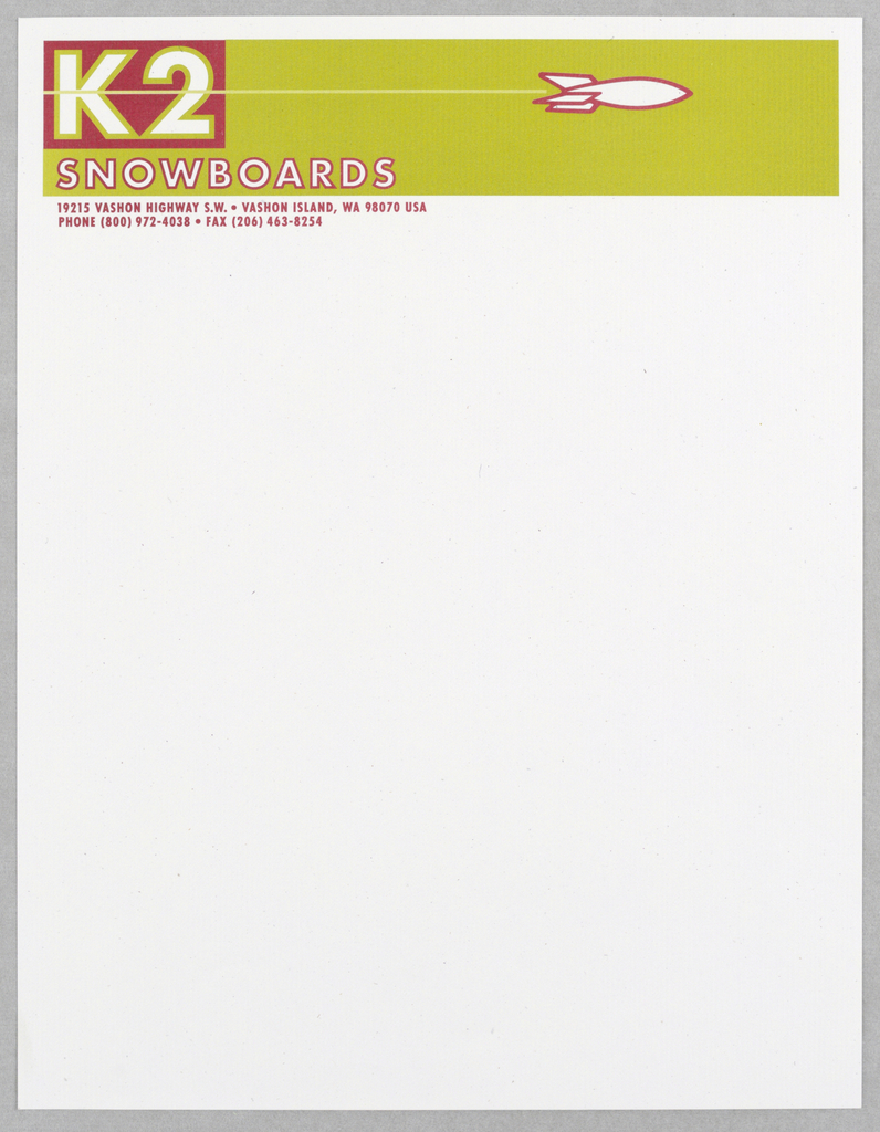 Printed in white ink with yellow outline, upper left: K2; in white ink with red oultine, upper left: SNOWBOARDS; in red ink, upper left: 19215 VASHON HIGHWAY S.W./VASHON ISLAND, WA 98070 USA