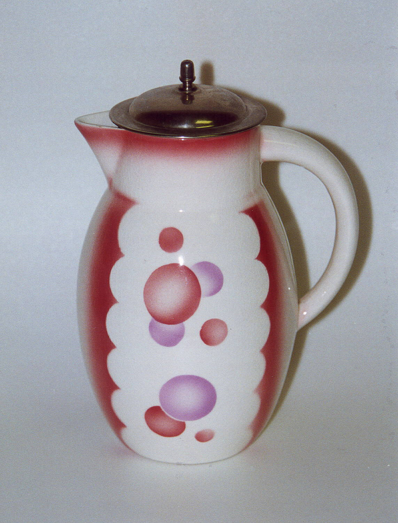 This is a Jug. It was manufactured by Elsterwerda. It is dated 1920–40 and we acquired it in 1997. Its medium is glazed earthenware and metal. It is a part of the Product Design and Decorative Arts department.