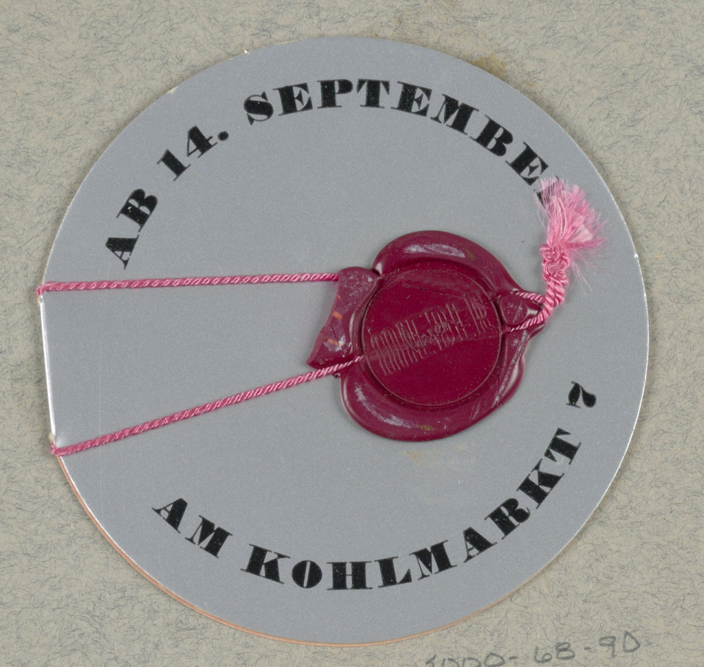 Business Card, AB14. September / am Kohlmarkt 7, Mieder-Piesen, 14 Sept. 1936; Published by Jahoda & Siegel (Austria); letterpress, pink string, sealing wax, on silver and orange paper board, mouted on grey-blue wove paper; Gift of James Howard Fraser; 2000-68-90