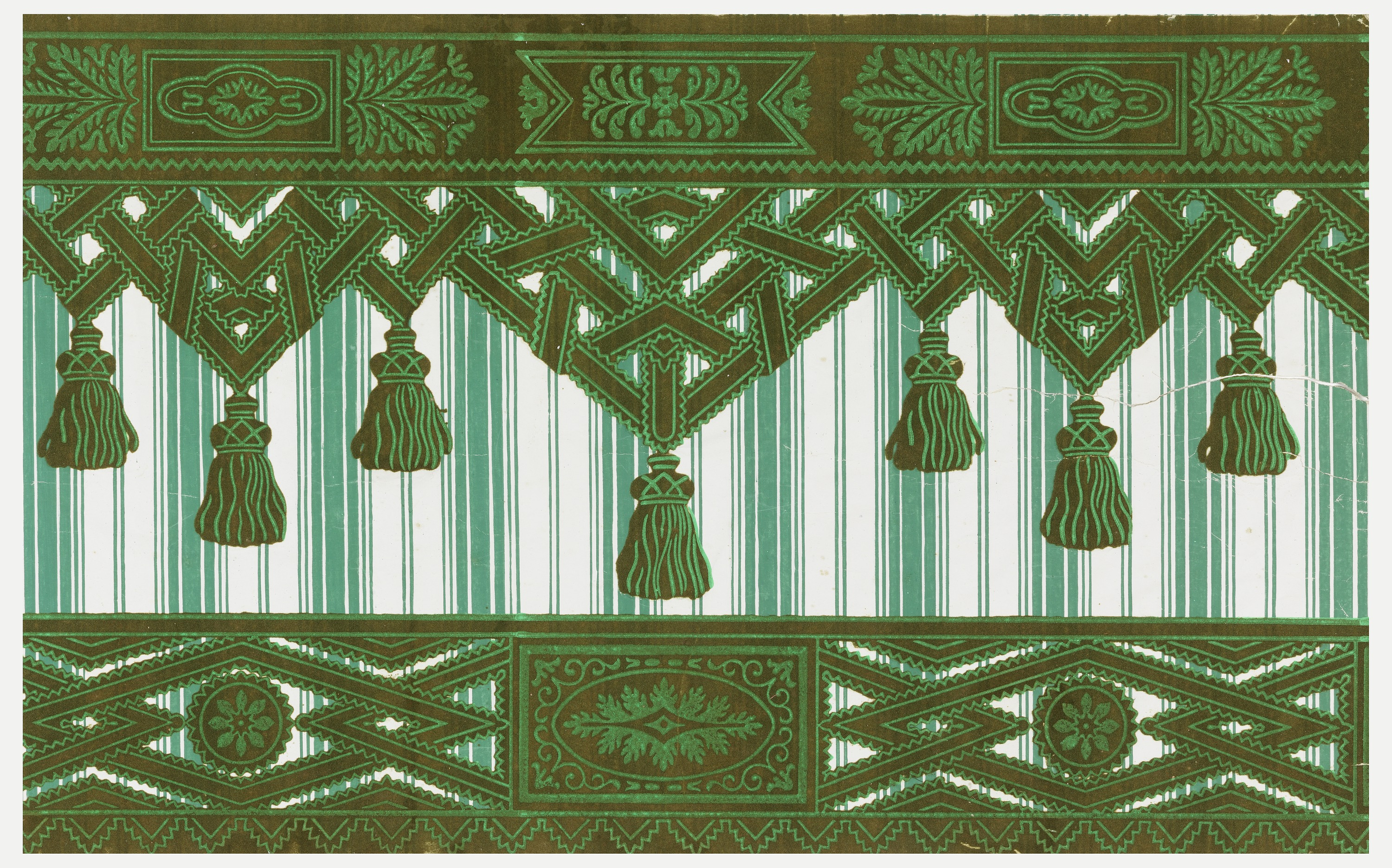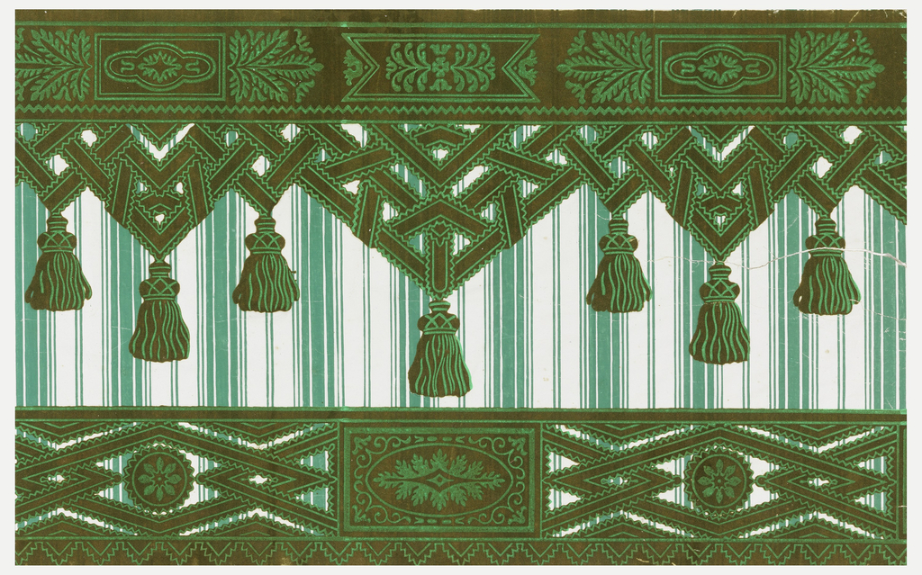 Included in the 1995 bequest from the estate of Elinor Merrill was a sophisticated and fanciful wallcovering consisting of a sidewall printed on glazed cotton ground with flocked top and bottom borders of a tessellated geometric design. The stripe has wavy and non-solid edges, a result of the trough printing production method, which was invented in 1843 and used for this wallcovering. Because of the heavily flocked top and bottom borders giving a three-dimensional effect and the non-regimented stripe of the sidewall, when installed in a room this wallcovering would give the feel of a tented room, draped in cotton with passementerie borders.