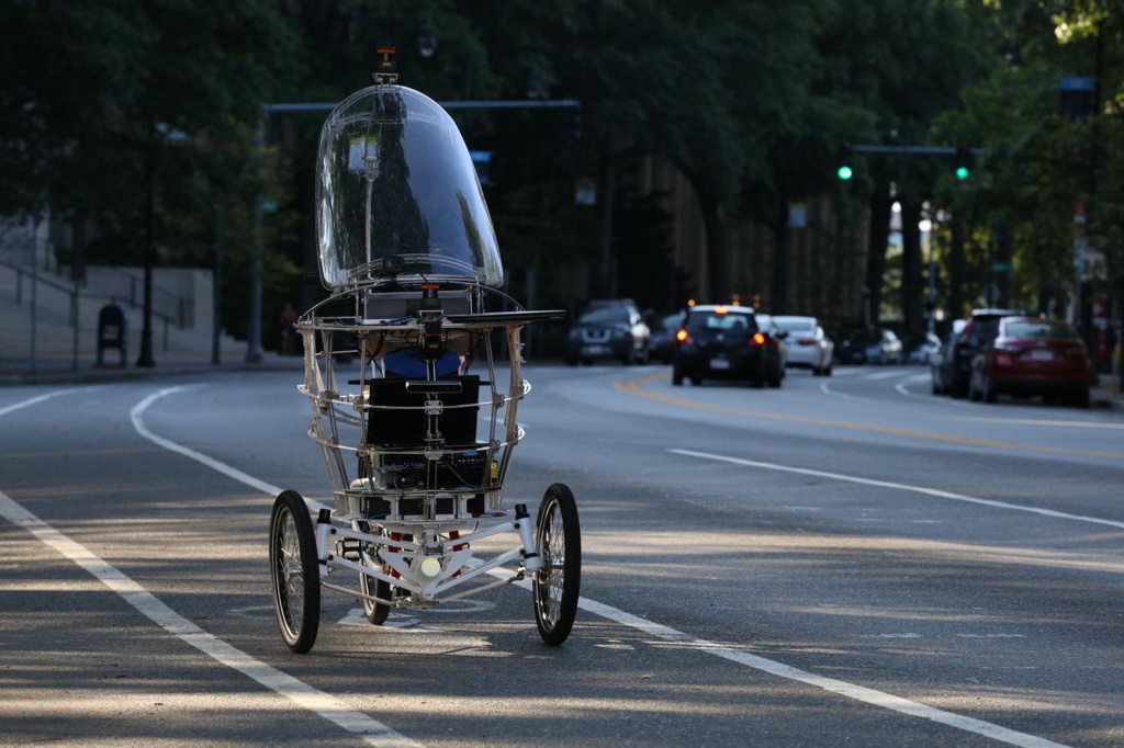 On the monitor above, watch what the PEV autonomous vehicle (AV) sees. The PEV’s LiDAR—a pulsing laser light that senses and measures distances to an object—detects and maps its surrounding physical environment for safe navigation.