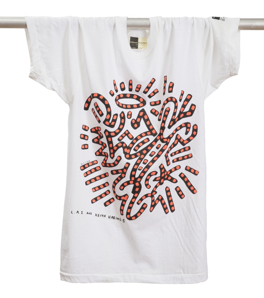 This is a T-shirt. It was designed by Keith Haring and LA II and made for WilliWear Productions.