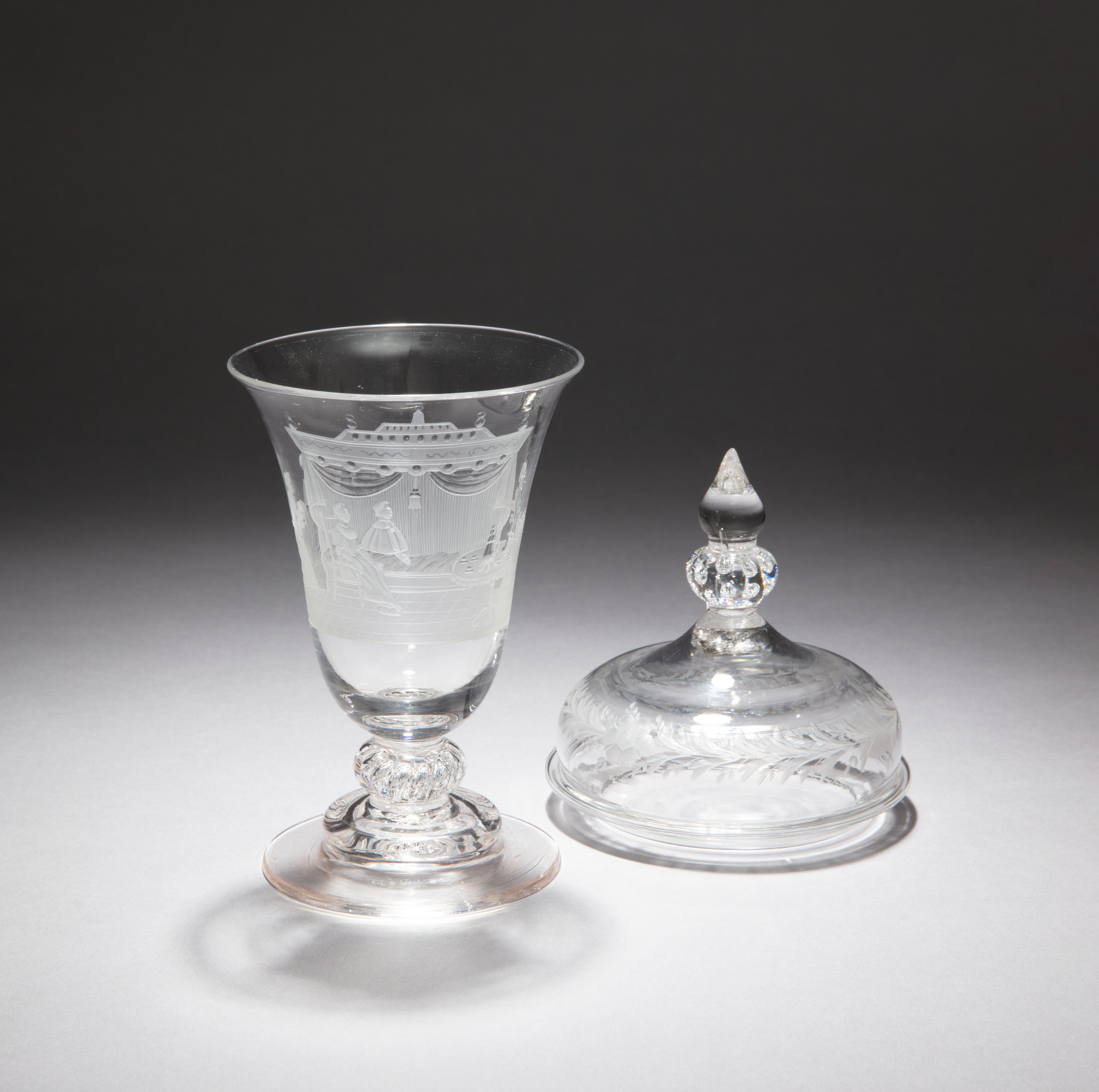 This is a drinking glasses and covers. It is dated ca. 1760. Its medium is lead glass. It is a part of the Product Design and Decorative Arts department.
